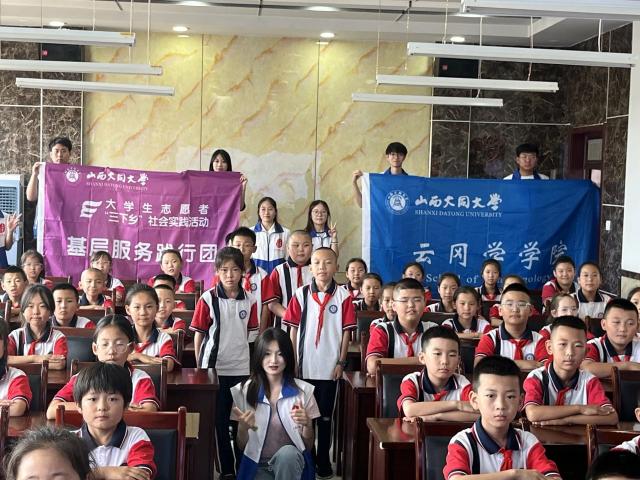 7月1日下午,实践团到达西坪小学。在与向学校校长、老师们的交流中成员们了解了学校学生学习情况、教学模式、普通话教学程度等问题。根据小朋友们的具体情况,实践团采用“宣讲+游戏”的方式向小朋友们进行云冈文化宣讲,旨在用“以游促学”的模式提高小朋友们的传承和保护民族文化的意识。