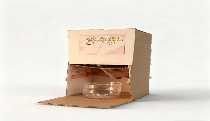 二等奖作品:《盒生·水滴站》由24会计二班刘晋欣、李多多、张瀚月、郤张敬、冯佳尧创作,这件作品以废弃纸箱为材料,制作成饮水机造型,内部通过简单的结构设计,实现了储水和出水功能。以可爱的装饰风格增加了作品的趣味性,传递了“变废为用”的环保理念。