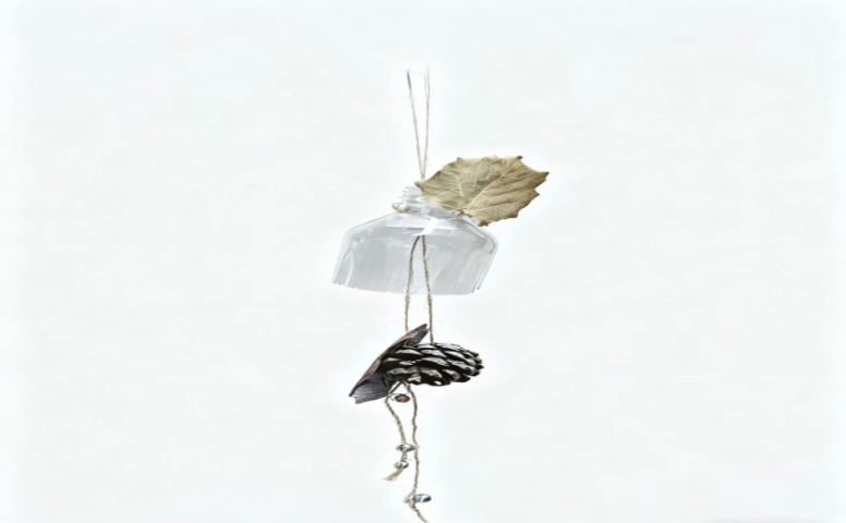 二等奖作品:《秋的声音》由25工商一班于欣可创作,作者以废弃塑料瓶为主体,搭配干枯树叶、松果等自然材料,制作成风铃,既实现了资源的再利用,又赋予了作品清新的自然气息。