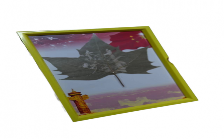 三等奖作品:《中国梦》由24国商一班刘健、常淮铖、薛永新创作,这件作品以干枯树叶为主体,搭配带有中国元素的背景,制作成装饰画。自然废弃物与文化元素结合,体现了对传统文化的传承与环保的重视。