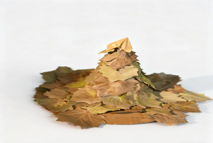 三等奖作品:《树叶女巫帽》由25工商一班陆恒洁,李雨微,刘慧蓉创作,这件作品以干枯树叶为材料,堆叠成帽子的造型,展现了自然材料的质感与形态。
