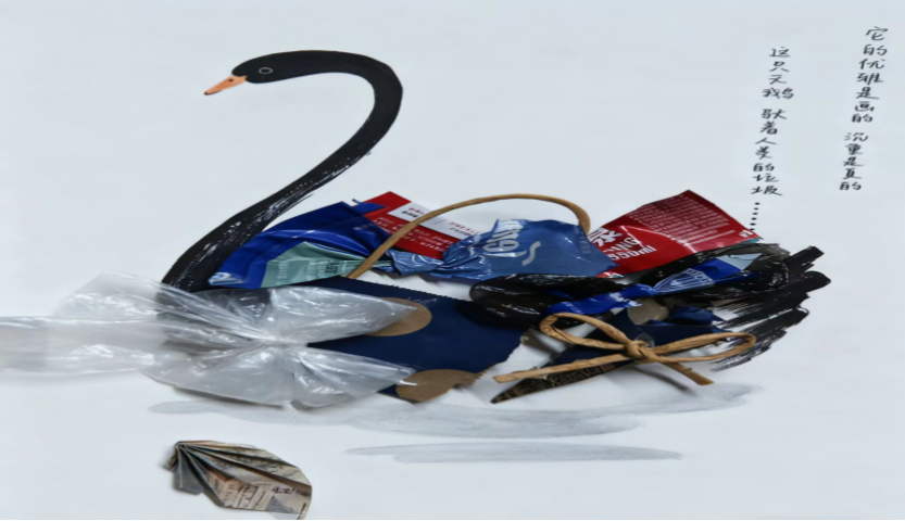 二等奖作品:《烬羽》由24工商一班刘鑫怡制作,作品以废旧塑料包装、纸袋等材料拼贴成天鹅造型,形成强烈的视觉对比。作者通过这种方式,既批判了塑料污染对自然的影响,又展现了废弃物的艺术价值。