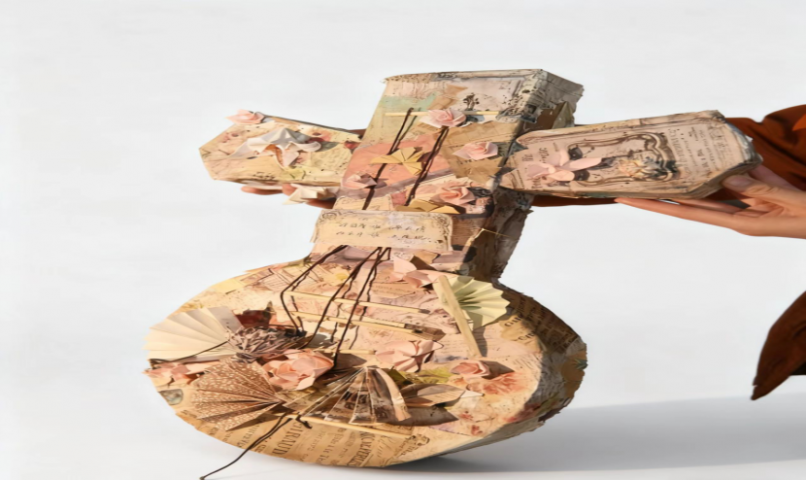 二等奖作品:《折纸花弦》由24会计一班王晓北与25国商一班毕仪清创作,作品以废旧报纸、书页为材料,通过拼贴、折叠等技法,制作出琵琶的造型。作者将废弃纸张转化为具有艺术感的乐器,展现了环保与艺术的融合。