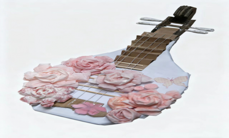 一等奖作品:《纸韵琵琶:素纸繁花的传统新声》由23会计二班崔紫萱、陈怡宁创作,作者以废弃纸箱为主体材料,通过切割、拼接制作出琵琶的基本结构,再用废纸折成花朵装饰琴身,既还原了琵琶的形态,又传递了“变废为美”的环保理念。