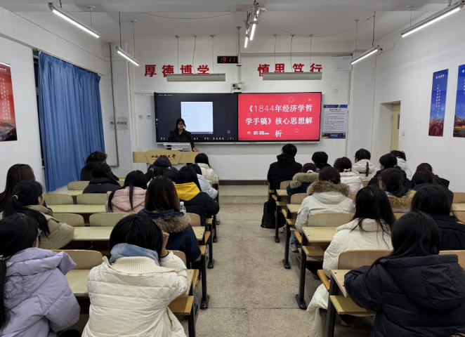 为深化马克思主义经典著作研读,筑牢理论学习根基,11月28日,马克思主义学院于行知楼109教室举办《1844年经济学哲学手稿》专题读书分享会。学院部分学生参与活动,主讲人24级思政二班钟海珍围绕这部马克思早期重要著作的核心思想展开系统讲解。