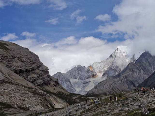 蓝天下,巍峨雪山半掩在云里,石径上人影零星,冷硬山石与圣洁雪峰相衬,满是自然的雄浑。