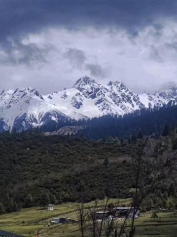 第二幅图拉萨的雪山峰顶常年被厚雪覆盖,在云层下闪着冷光,山脚下的草地还带着点绿意,几座小屋散在林间,雪线和绿意的交界格外清晰,风好像能把山顶的雪雾吹到眼前,满是旷野的凛冽和辽远。
