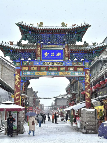 第一幅图太原的雪景带着人间烟火气,雪花落在“食品街”的彩绘牌坊上,把红柱金纹衬得更鲜亮了些。街上的行人裹着厚外套,有的撑着伞,脚下的雪被踩得发实,两侧店铺的红灯笼也沾了雪,冷意里混着热热闹闹的市井味儿。