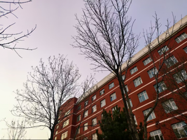 红墙接住淡紫的天,秃枝在风里写细瘦的诗——是冬天里,教学楼藏着的温柔暮色。