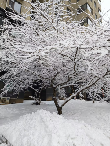 那天,清晨起来便看到了银装素裹的世界。雪裹满枯枝,蓬松得像落了层糖霜,地面厚雪堆成软乎乎的坡。楼宇的黑色冷硬外墙衬着这抹白,冬日的清寂里裹着点温柔的静。