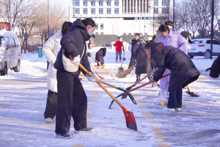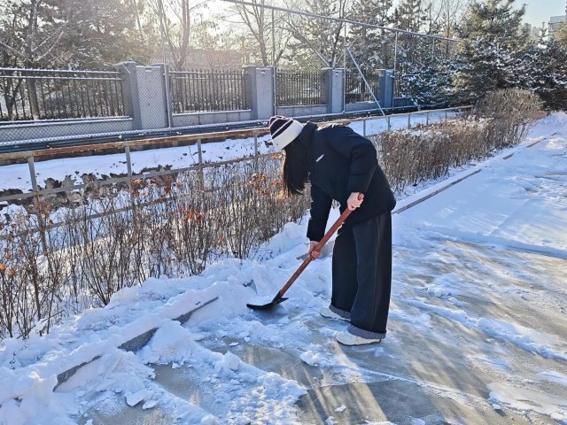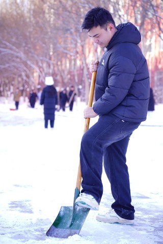 清雪过程中,同学们以雪为令、不畏严寒,手持铁锹、雪铲、扫帚等工具迅速集结,有条不紊地投入作业。大家分组协作、默契十足:有的奋力铲除路面厚实积雪与薄冰,有的挥帚清扫残余浮雪,还有的专门负责将积雪集中转运至指定堆放点,流程衔接顺畅。在校园主干道、教学楼出入口、台阶坡道等易滑关键位置,大家尤为细致,反复清扫、不留死角,全力消除通行隐患。尽管寒风凛冽,冻红了双手、呵出了白雾,但现场氛围热火朝天。铲雪的“锵锵”声、扫地的“沙沙”声、彼此鼓劲的交谈声交织在一起,奏响了冬日校园里最动人的劳动乐章。在同学们同心的高效协作下,原本被积雪覆盖的路面很快恢复本色,一条条安全畅通的通道,不仅保障了师生出行,更彰显了团结担当的青春力量。
