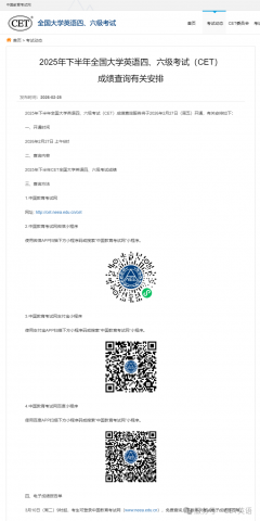 2025年下半年全国大学英语四、六级考试(CET)成绩查询服务将于2026年2月27日开通,有关安排如下: