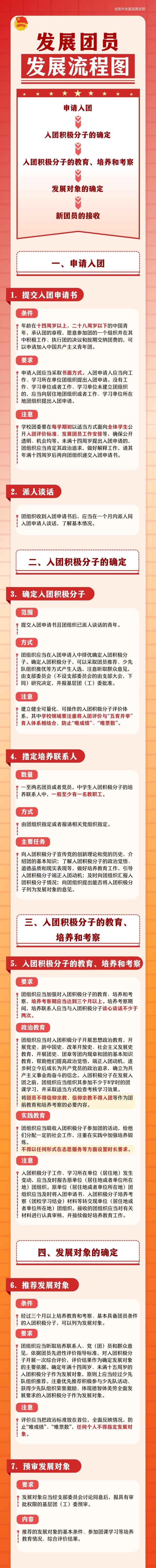 根据2023年8月共青团中央修订《中国共产主义青年团发展团员工作细则》(请点击文末阅读原文查看),发展团员分为申请入团、入团积极分子的确定、教育培养和考察、发展对象的确定、新团员的接收5个阶段15个步骤。