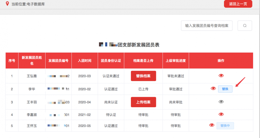 (2)点击“操作”栏的“替换”按钮即可重新上传团员电子档案。