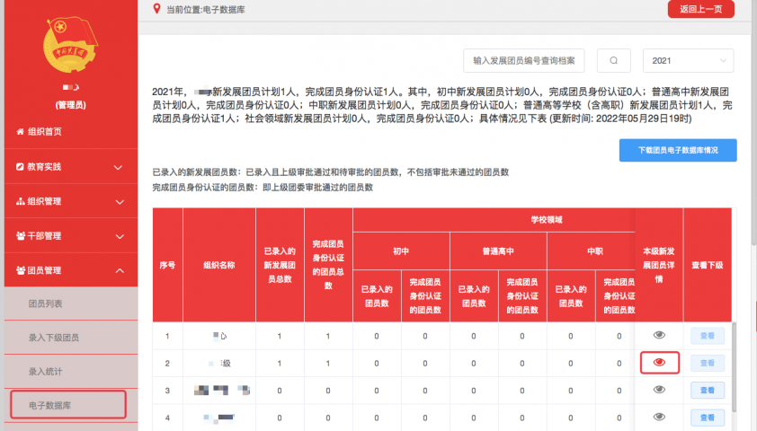 2. 具体操作步骤。 (1)管理员点击“团员管理-电子数据库”菜单,进入默认界面,然后点击表格中“本级新发展团员详情”列的眼睛图标打开新发展团员列表。