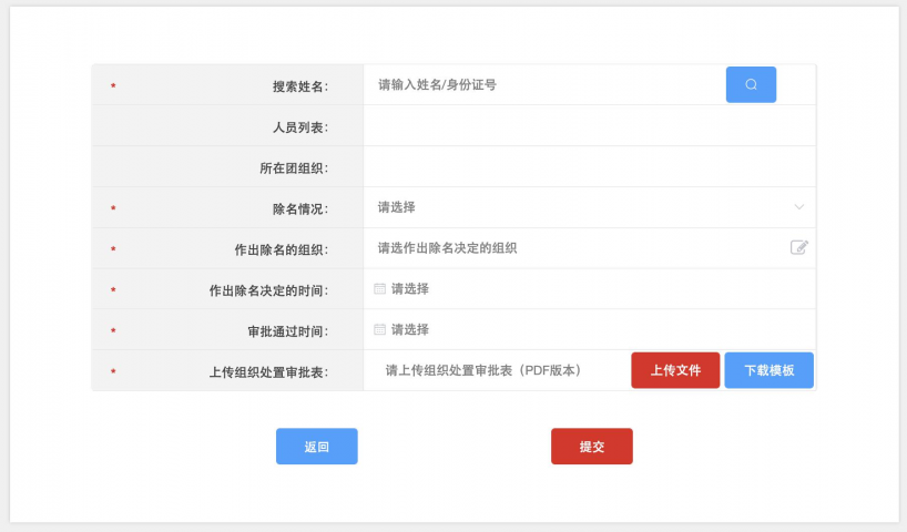 (2)点击右上角“标记除名”按钮,进入操作界面。输入团员身份证号码或姓名(建议优先使用身份证号码)进行查询。按照实际情况,选择除名情况、作出除名的组织、作出除名决定的时间、审批通过时间,并上传填写完整并盖章的组织处置审批表(PDF版本,模版可从系统中下载)。