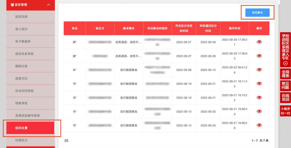 注意:标记“除名”后,团员将在系统中删除,该操作无法 修改或撤销。