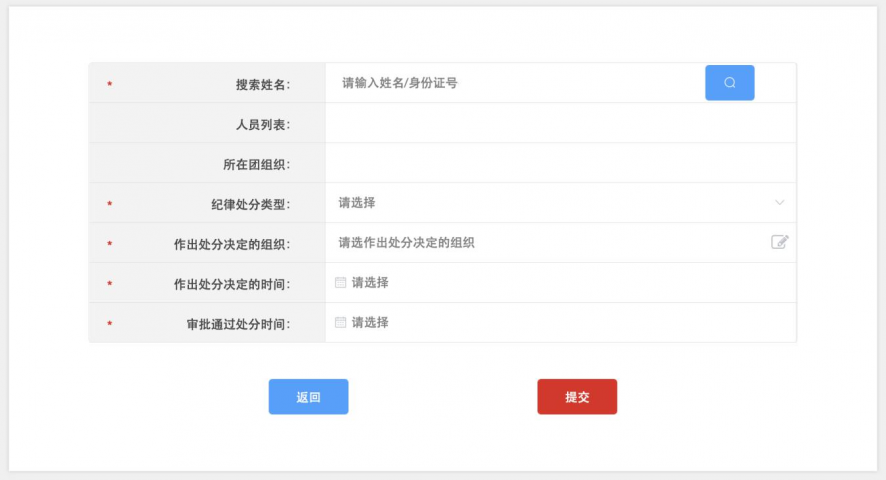 (2)点击右上角“标记团员处分”按钮,进入操作界面。 输入团员身份证号码或姓名(建议优先使用身份证号码)进行查 询。按照实际情况,选择纪律处分类型、作出处分决定的组织、 作出处分决定的时间、审批通过处分时间。