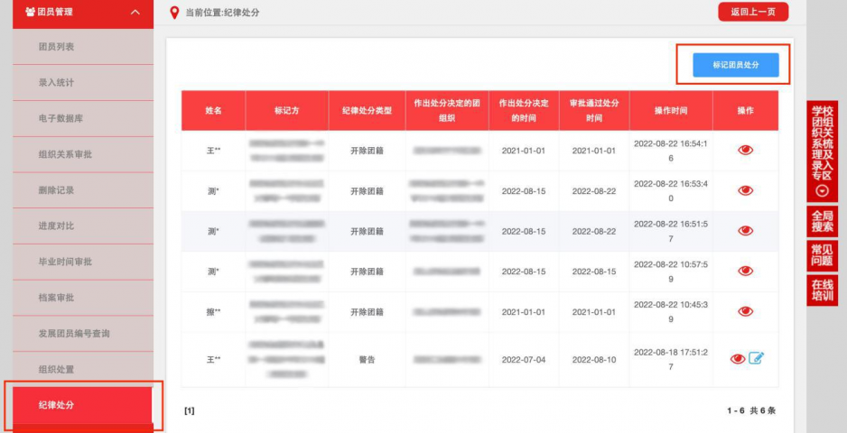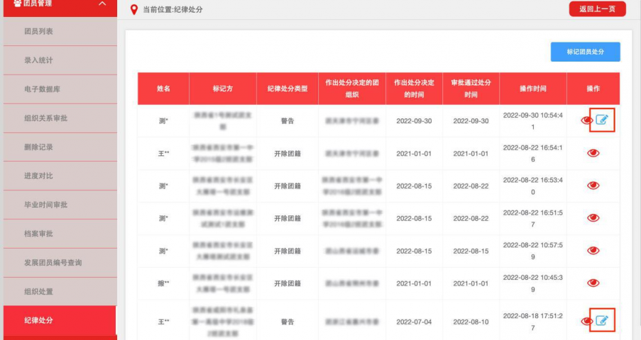 县级及以上团的领导机关(含系统团委)可对受到纪律处分 的辖内团员进行“警告”、“严重警告”、“撤销团内职务”和“留 团察看”标记。省级团委(含系统团委)可对受到纪律处分的辖 内团员进行“开除团籍”标记。 注意:标记“开除团籍”后,团员将在系统中删除,该操作 无法修改或撤销。