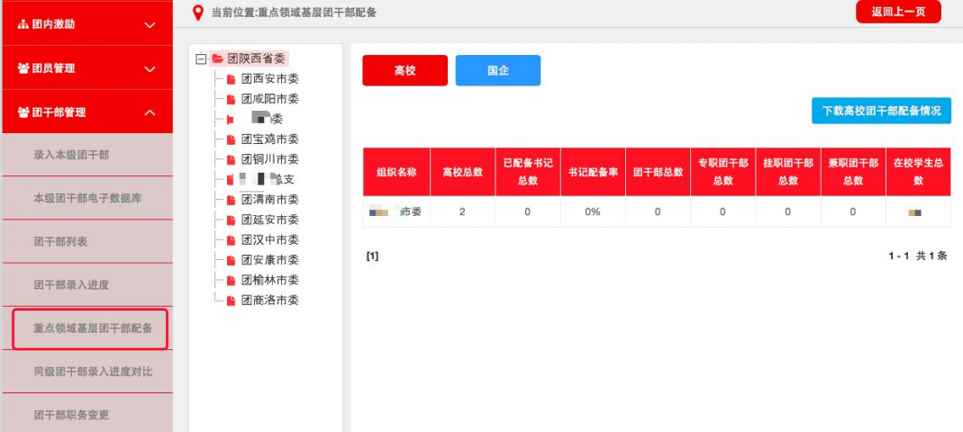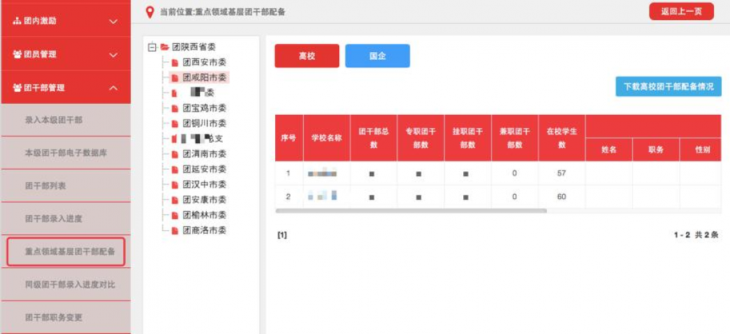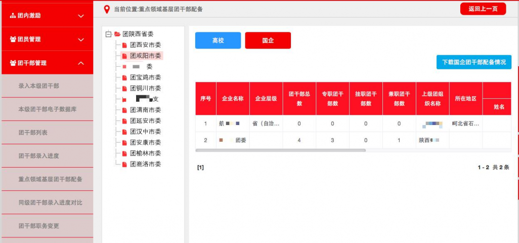 上级团组织可以通过该功能掌握高校、国有企业领域团干部配备情况。目前该功能开放至地市级团委。