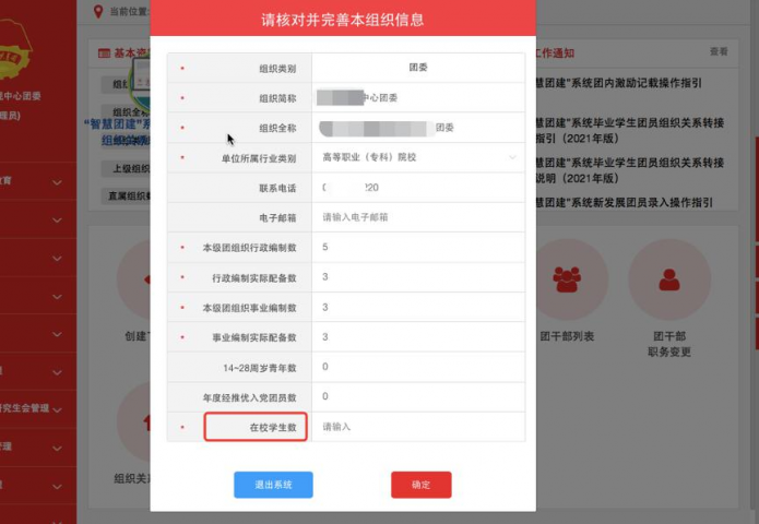 2.2.1若团组织的行业类别为“普通高等院校”或“高等职业 (专科)院校”,“核对并完善本组织信息”弹出框中将新增必填信息“在校学生数”, 高校本级管理员登录系统后须完善“在校学生数”信息后方可进入系统。