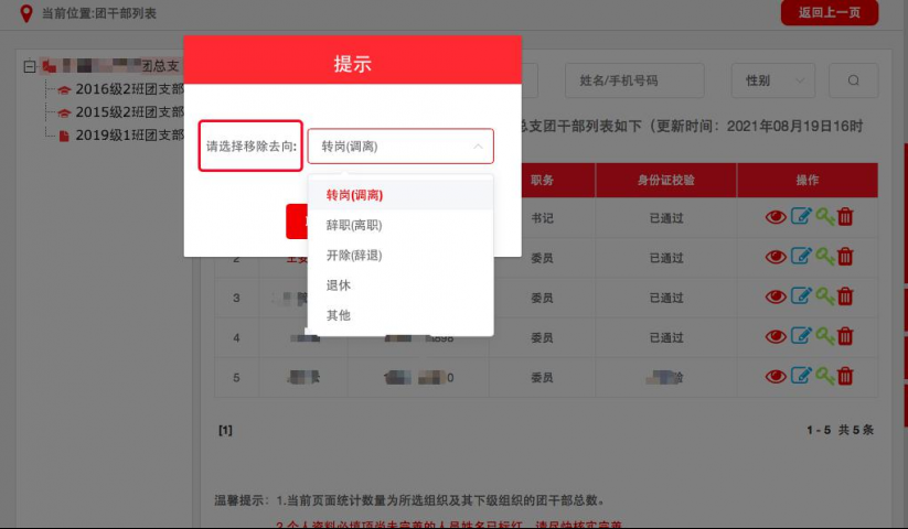 2.4.1 管理员点击“团干部管理-团干部列表”菜单, 点击“操作”栏的移除图标,再选择移除去向;若实际去向超出系统所列去向选项, 可点击“其他”并填写具体去向即可。