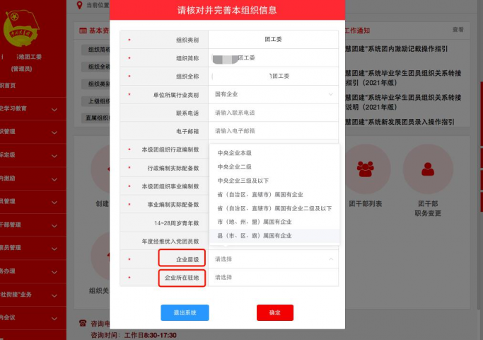 2.2.2若团组织的行业类别为国有企业,“核对并完善本组织信息”弹出框中将新增必填信息“企业层级”、“企业所在驻地”,团组织管理员登录系统须完善信息后方可进入系统。