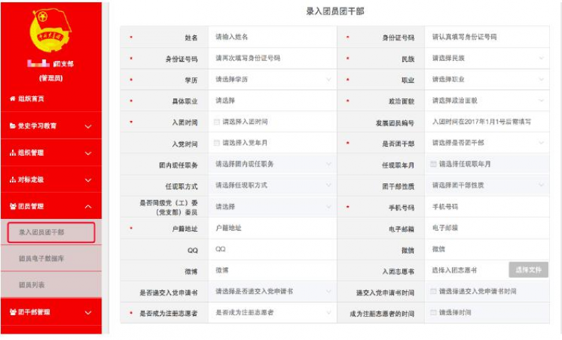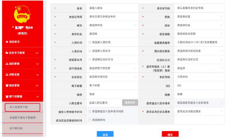 根据系统提示,须依次录入团干部以下信息:姓名、身份证号码、民族、学历、职业、在读状况/具体职业、政治面貌、入团时间、发展团员编号、入党时间(中共党员/预备党员填写)、团内现任职务、任现职年月、任现职方式、团干部性质、是否同级党(工 )委(党支部)委员、在岗状态、手机号码、是否递交入党申请书、递交入党申请书时间、是否成为注册志愿者、成为注册志愿者的时间等基本信息。如录入人员未满18 周岁, 则“是否递交入党申请书”为非必填选项。如录入人员入团时间为 2020年前,则“入团志愿书”为非必填选项。