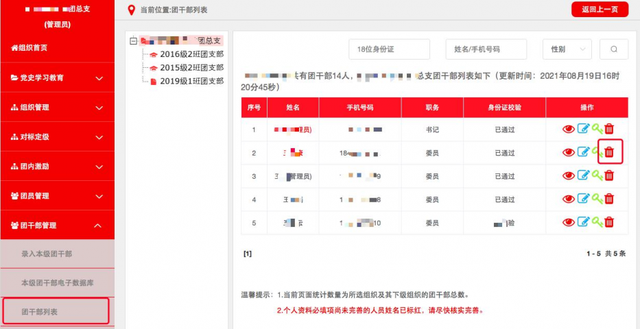 团的领导机关、基层团委管理员有权限移除本组织的团干部。移除团干部指不再担任团干部职务,并非从系统内删除。