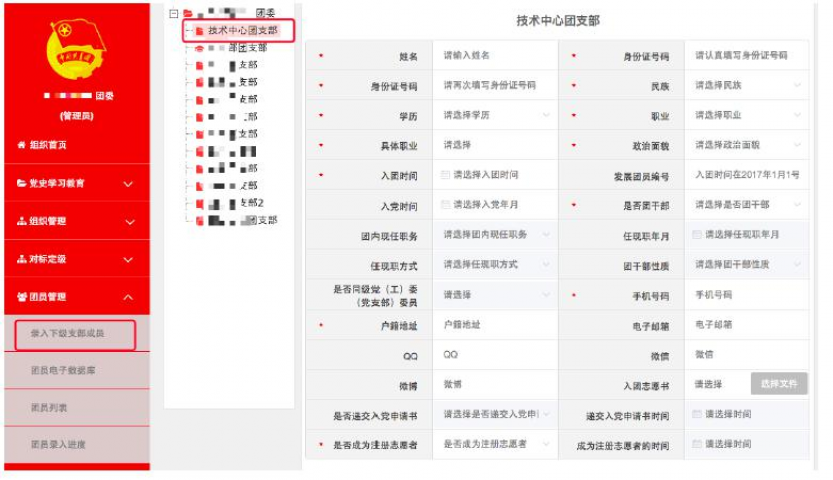 2.1.2 上级团组织录入下级团支部团干部。团委/团工委/团总 支管理员登录“智慧团建力系统进入管理中心,点击“团员管理 -录入下级支部成员力菜单进入录入界面。在界面左侧组织树中 选择录入人员所在支部。