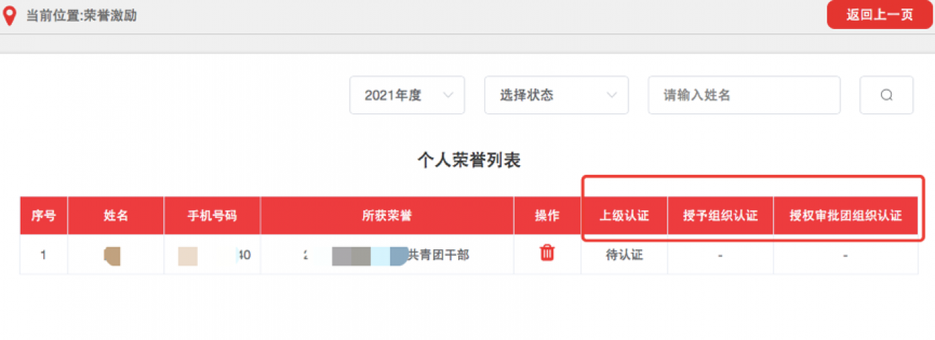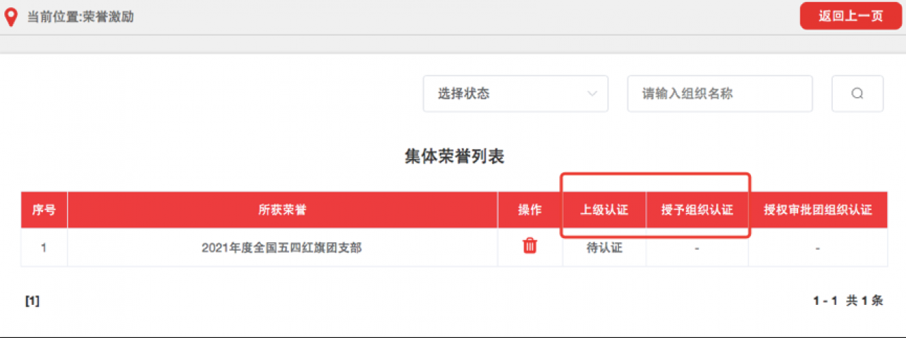 3.3.3荣誉记载完成并提交后,须由授予组织审核。如记载方为团(总)支部,则须经直属上级团组织审核通过后再由授予组织审核,审核通过后生效;如记载方和授予组织为同一组织,则录入后直接生效。授予组织也可点击界面中的“授权审批团组织”选择下级组织进行审核。团组织管理员可在相应荣誉记载列表中查看审核进度和所获荣誉信息,如记载信息有误可在上级审批前进行删除操作,如上级已审批则不可删除。