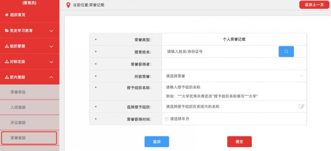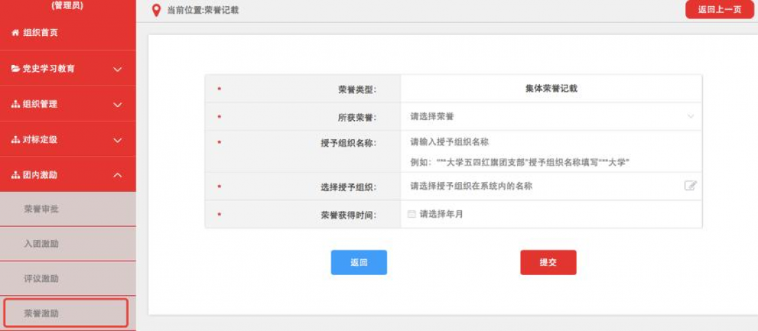 3.3.荣誉激励。记载各级优秀共青团员、优秀共青团干部(含少先队辅导员)、五四红旗团组织、青年五四奖章等团内个人和集体政治类荣誉。各级团组织均具有荣誉激励记载权限。具体操作步骤如下。