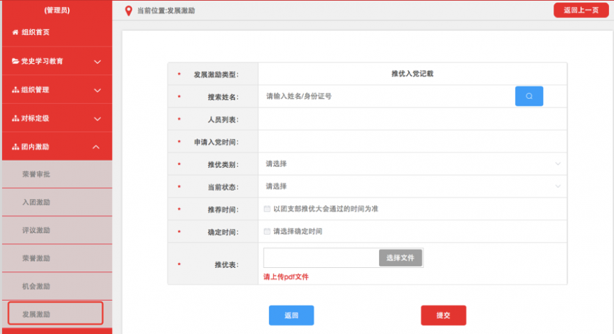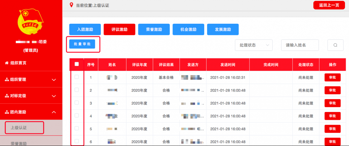 3.5.4发展激励相应记载完成并提交后,如记载方为团(总)支部须由直属上级团组织进行审核,审核通过后生效。团组织管理员可在相应列表中查看审核进度和记载信息,如记载信息有误可在上级审批前进行删除操作,如上级已审批则不可删除。