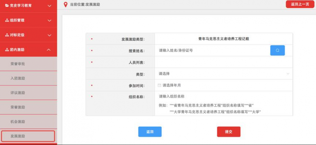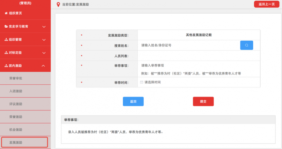 3.5发展激励。记载推荐参加青年马克思主义者培养工程、乡村(社区)“两委”人选、优秀青年人才举荐、推优入党等。各级团组织均具有发展激励记载权限,具体操作步骤如下。