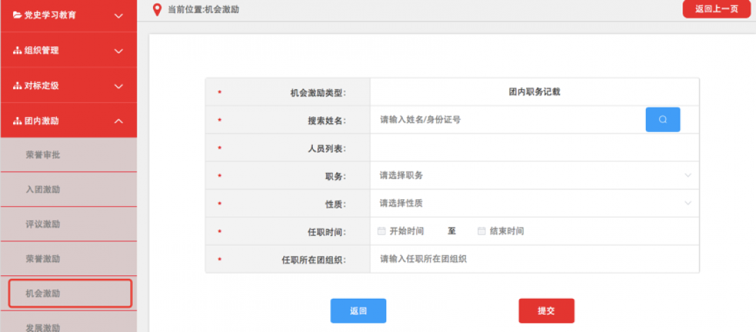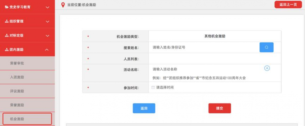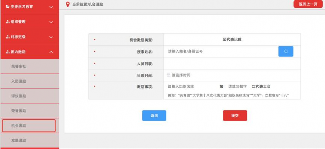 3.4.5机会激励相应记载完成并提交后,如记载方为团(总)支部须由直属上级团组织进行审核,审核通过后生效。团组织管理员可在相应列表中查看审核进度和记载信息,如记载信息有误可在上级审批前进行删除操作,如上级已审批则不可删除。