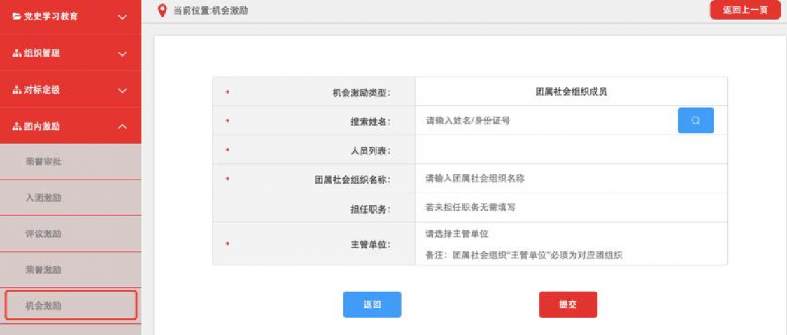 3.4机会激励。记载担任团内职务,作为团代表(团的委员会成员)人选,团属社会组织成员,以及推荐参加团的重大活动、特色实践活动、党和政府重大活动等信息。各级团组织均具有机会激励记载权限,具体操作步骤如下。