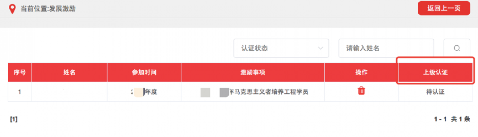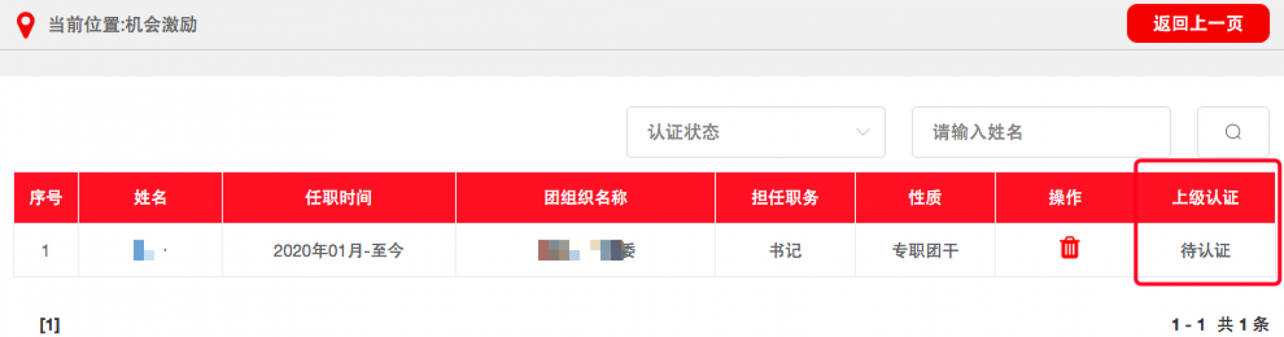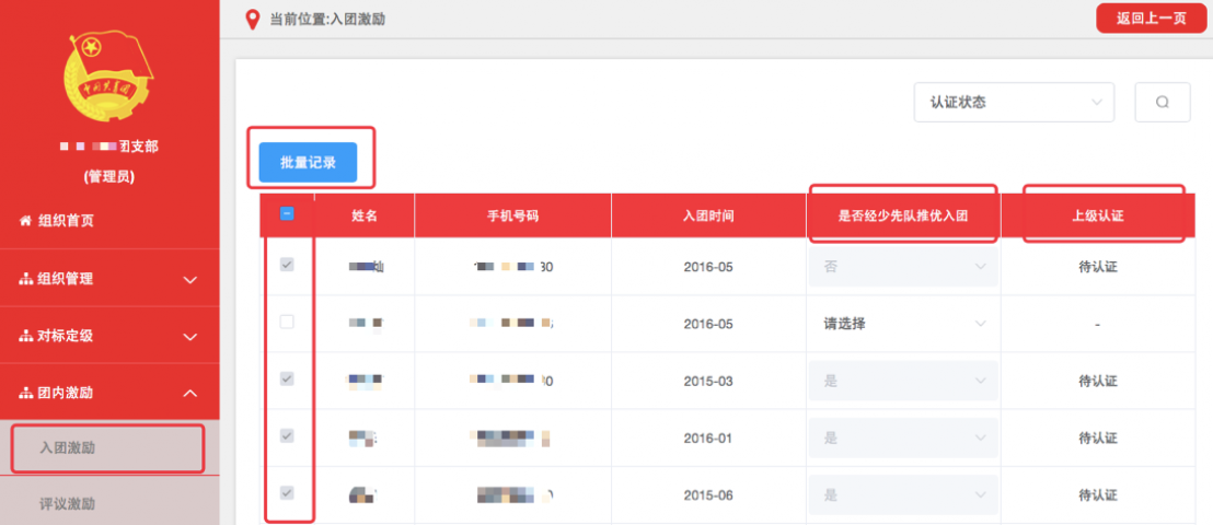 3.1.3记载完成后,须由直属上级团组织审核,审核通过后生效。团支部管理员可在“上级认证”列查看审核进度。
