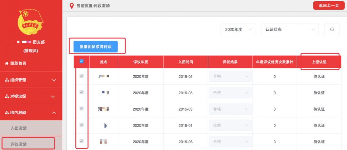 3.2.3评议结果记载完成后,须由直属上级团组织审核,上级团组织可结合实际调整评议等次。根据审核规则,评议结果为基本合格/不合格的团员,上级团组织在审核前须审阅组织处置或纪律处分决定。团支部管理员可在“上级认证”列中查看审核进度。