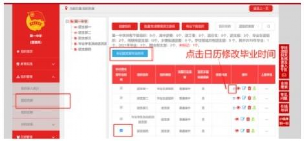 1.1.2勾选需要标记的团支部,点击左上角的“标记团支部团员毕业时间”
