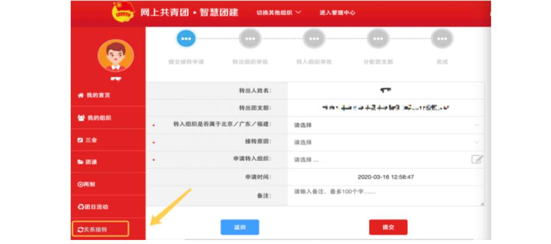 团员个人发起的情况,可以由团员登录系统进入个人中心,点击左侧“关系转接”,选择转入组织是否属于北京/广东/福建、转接原因,根据提示选择完成申请。