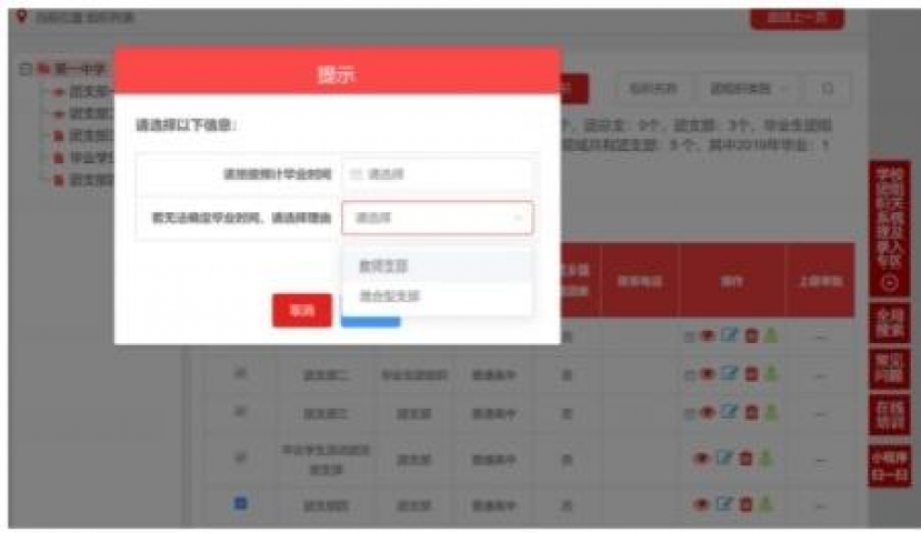 1.1.3 选择该团支部的预计毕业时间(必选项)。无法确定毕业时间的,须选择理由(教师支部/混合支部)。
