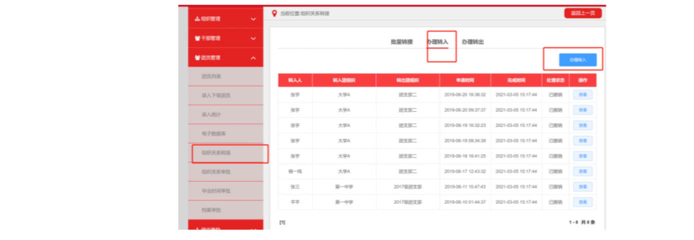 选择转入的组织是团委/团工委/团总支,则该组织管理员在