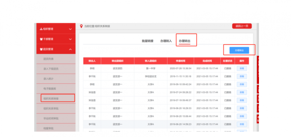 转出团组织管理员进入管理中心,点击“团员管理一组织关系转接”菜单,点击“办理转出”,选择转出团支部、转出人姓名、转入组织是否属于北京/广东/福建、转出原因,根据提示完成转接。