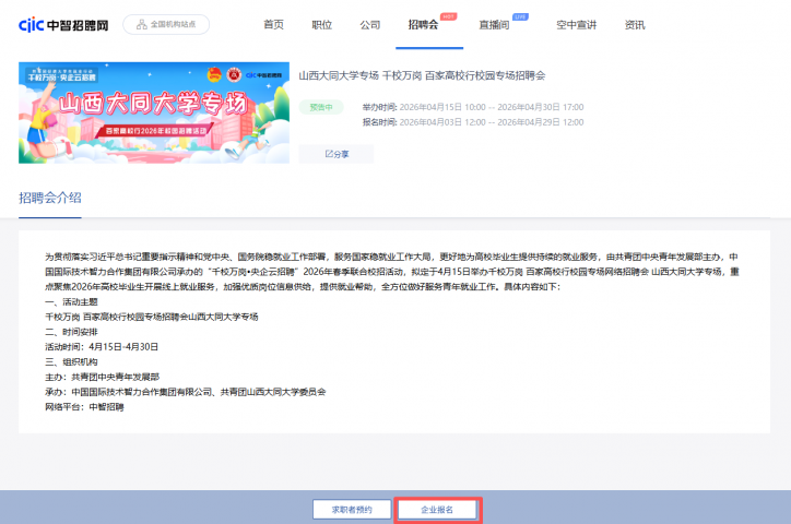 进入招聘会专题页(www.ciiczhaopin.com/jobfair/detail?jobFairId=2039947680462008322) 点击页面右下角【企业报名】按钮。